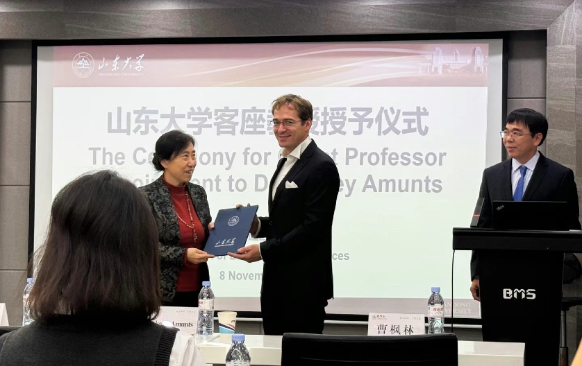 11月8日下午,齐鲁医学院在趵突泉校区教学六楼举行仪式,授予Alexey Amunts博士山东大学客座教授称号。齐鲁医学院常务副院长马春红、基础医学院院长高成江、基础医学院李文斐教授团队师生等出席仪式。