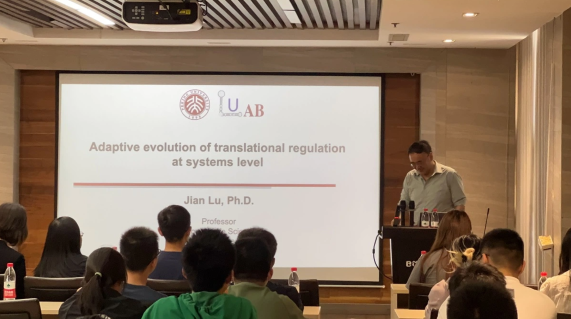 mRNA翻译调控在真核生物各种生命活动中发挥重要作用。真核生物mRNA的一个重要特征是具有5’和3’非翻译区(UTR)。位于5’UTR的上游开放阅读框(uORF)通过竞争性地结合核糖体来抑制下游蛋白编码区(CDS)的翻译,这一调控机制在真核生物中广泛存在。陆剑教授团队利用核糖体图谱技术和演化基因组学详细讲述了uORF的分布特征和演化规律,以果蝇作为模式生物,揭示了uORF介导的翻译调控在生物体的发育调控、胁迫应答和生物钟调节等生命过程中的重要功能,在mRNA翻译水平上验证并拓展了生物演化理论。报告结束后,与会师生与陆剑教授进行了深入讨论,并对提问进行了详细解答。