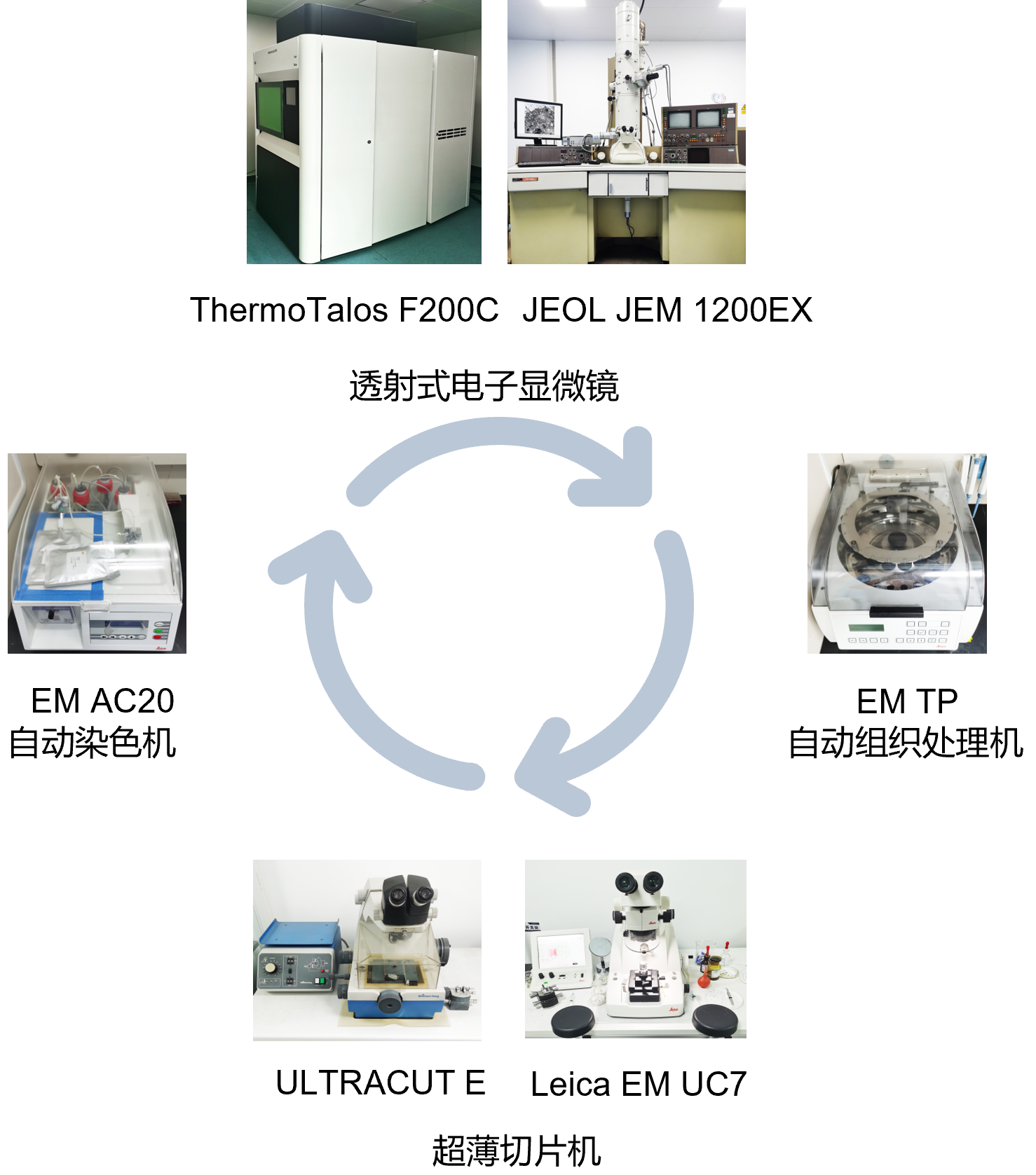 电镜平台:本平台拥有2台电子显微镜,包括FEI Talos F200C 200KV 场发射透射电镜和JEOL JEM-1200EX 120KV透射电镜,主要用 于研究各种生物组织、细胞、细胞器及生物大分子的超微结构及病理变化。同时配备了剑桥ULTRACUT E超薄切片机、 Leica EM UC7超薄切片机、Leica EM TP组织处理机及EM AC20自动染色仪等生物制样设备,可以满足各类生物电镜样品的制备需求。本平台在完成学校布置的教学任务基础上,致力于为校内外医学科研单位和临床相关科室提供优质的电镜分析测试服务。